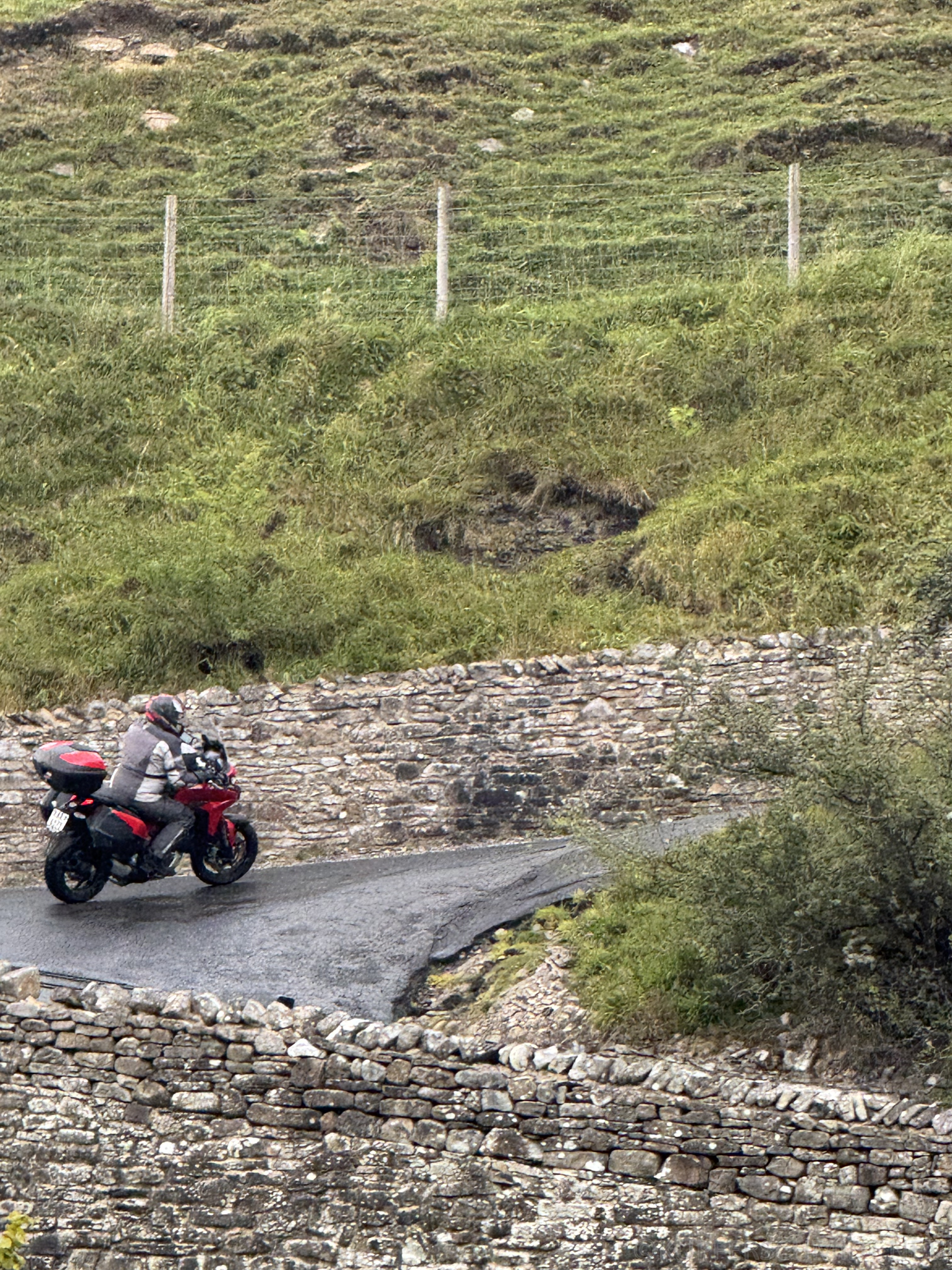 Wir fahren dann weiter über Hügel und Täler, bei denen die Strassen steil auf und ab gehen, so steil, dass man sich fast auf einer Achterbahn fühlt. Einmal haut es uns sogar aus dem Sitz bei einer Bodenwelle. Kurz vor Kettlewell entscheiden wir uns zu einem Kafihalt und feuern unsere Bialetti ein. Kaum haben wir den Kafi eingegossen, beginnt es zu regnen und diesmal nicht nur tröpfchenweise sondern so stark, dass wir uns grad knapp noch gegen die Regenklamotten entscheiden. Weiter geht es über den Buttertubbs Pass (zwischen Hawes und Thwaite gelegen) und mit einer Höhe von 526m ein eher hoher Pass im Vereinigten Königreich. Die Gegend ist atemberaubend und zwischendurch hat es unglaublich steile Stellen von bis zu 25% (Stonesdale Lane kurz vor West Stonesdale). Das Wetter zeigt sich gnädig oder wir haben einfach ein Glück, dass unserer Route immer entgegen des Schlechtwetters abzweigt. Gegen 17 Uhr kommen wir in Middelton-in-Teesdale an und entschliessen uns, uns nach einer Unterkunft umzusehen.