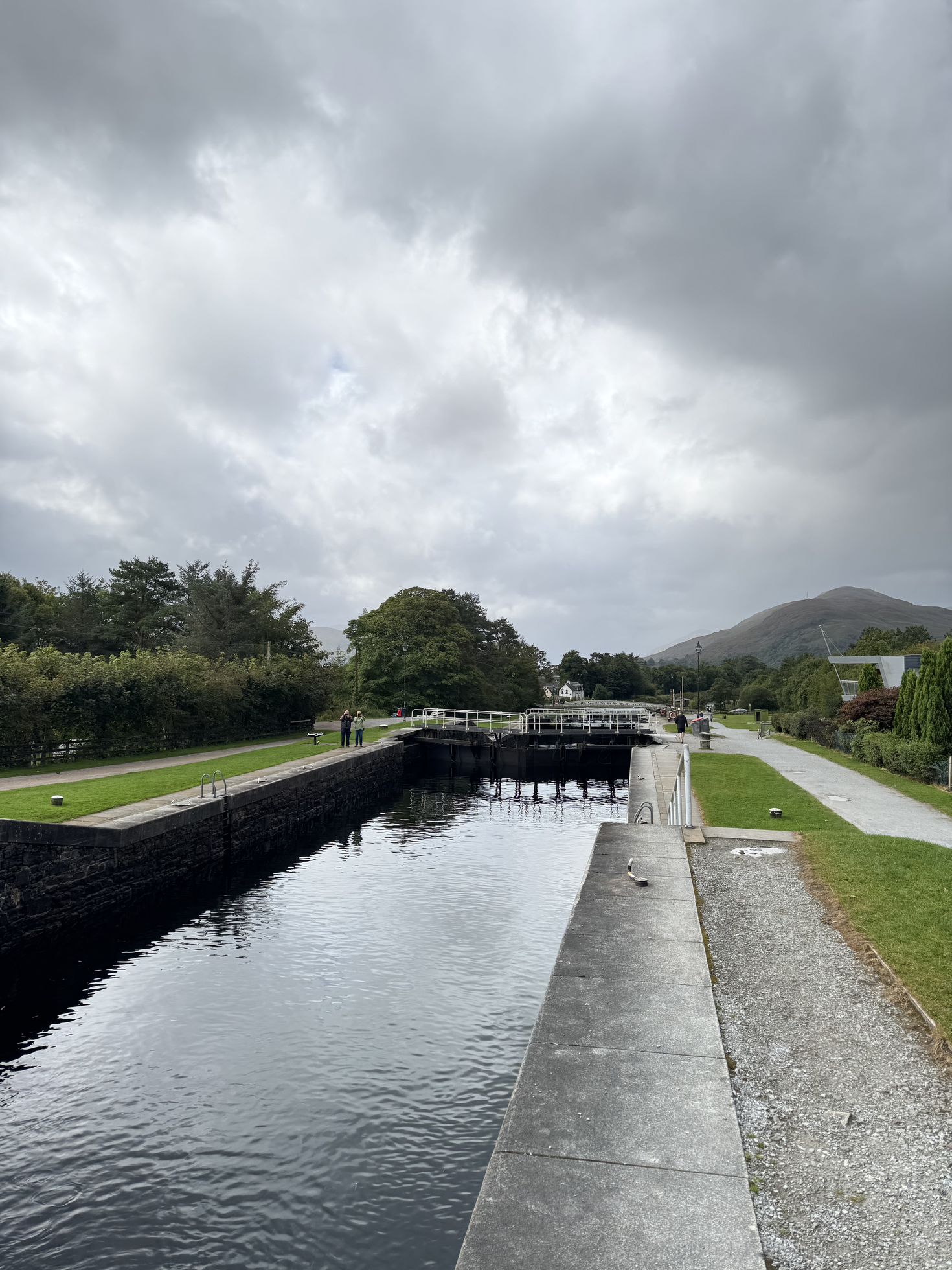 Da wir auch gestern weit in die Reserve gefahren sind, gehen wir auf Nummer sicher und suchen uns gleich als erstes eine Tankstelle. Die erste Tankstelle in Morar ist ausser Betrieb, die zweite in eigentlich entgegengesetzter Richtung in Mallaig, was uns als sinnvoller erscheint, da in der Fahrtrichtung auf den ersten Kilometern keine Tankstelle angezeigt wird. Also fahren wir nach Mallaig und zu unserem Erstaunen hat diese, obwohl es einen Kartenautomaten hat, geschlossen. Also pflanzen wir uns auf ein Bänkchen und warten die halbe Stunde bis sie öffnet. Kaum sind wir vollgetankt losgefahren, beginnt es bereits zu tröpfeln und grad so viel, dass wir uns überlegen, die Regenklamotten anzuziehen. Beim Glenfinnan Viadukt auf dem Besucherparkplatz wollen wir dies erledigen, aber dort angekommen scheint es aufzuklaren und wir beschliessen, weiterzufahren. Unser Unglück mit der Fähre ist auch unser Glück, wir fahren in Richtung Fort Williams und somit auch in Richtung der Nevis Bergkette mit dem Höchsten Berg von ganz Grossbritannien, dem Ben Nevis welcher stolze 4’413 Fuss hoch ist (1’345m). Da er aber bei Meereshöhe beginnt ist seine Erscheinung doch recht beeindrucken. Ausserdem kommen wir unverhofft an den Stufen Neptun’s (Neptune’s Staircase) vorbei. Ein eindrückliches Schleusensystem mit 8 Schleusen, welche Boote während 90 Minuten über 20 Höhenmeter befördert. Wir haben Glück und es hat gerade Boote in den Schleusen und wir können zusehen wie das Ganze funktioniert, ganz eindrücklich. Bei der Gelegenheit genehmigen wir uns einen Kafi und lenzen die Blase. Weiter führt uns unser Weg nach Norden. Bei Commando Memorial haben wir nochmals einen unglaublichen Blick über die Ebene und die entfernte Nevis Bergkette. Am Lock Lochy vorbei führt es uns in Richtung Invergarry. Dort biegen wir auf die A87 Richtung Westen ab. Die Landschaft ist atemberaubend, weite Täler mit schrägen Berghängen, welche bis auf den Gipfel grün bewachsen sind. Alle paar Meter könnte man einen Fotohalt einlegen, so eindrücklich ist die Landschaft. Aber dennoch wären die Bilder irgendwie alle gleich. Wir fahren weiter in Richtung Kyle of Lockalsh, welches uns als Start und Ziel für die morgige Erkundung der Isle of Skye dient. Zuvor kommen wir aber noch beim Eilean Donan Castle vorbei, welches eindrücklich auf einer Insel thront und über eine Steinbrück erreichbar wäre, wir sparen uns die je 12£ und fahren zum Viewpoint hoch, welcher einen super Blick über das Castle bietet. Jetzt geht’s erstmals ins Feierabendbier.