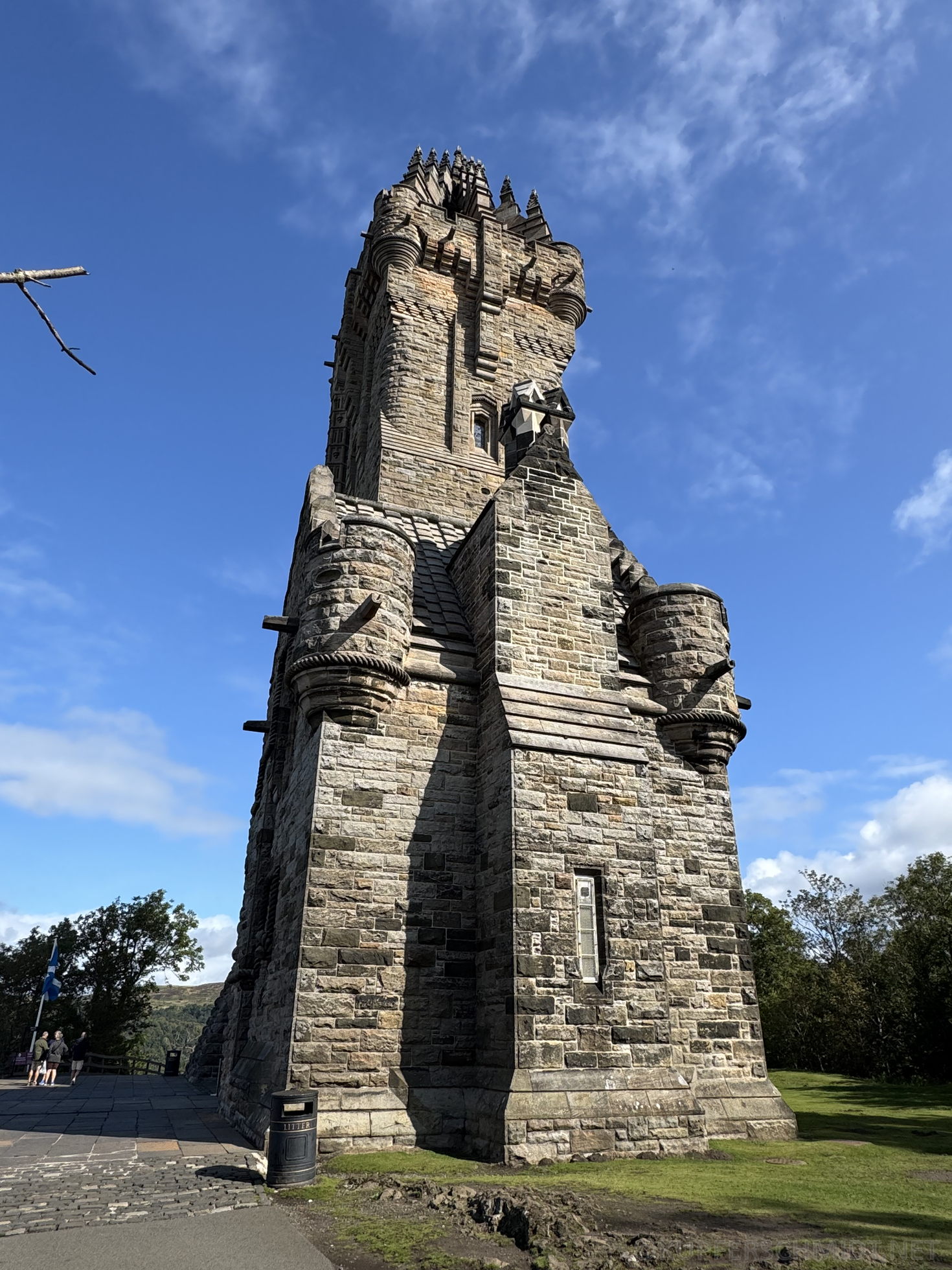 Oben angekommen, erblicken wir den imposanten Turm, 67m hoch und im Jahre1869 im Gedenken an den schottischen Freiheitskämpfer William Wallace errichtet. Wir bezahlen den üblichen Obulus und machen uns die schmale Wendeltreppe hoch auf den Weg nach oben. Diese Treppe ist so schmal, dass man sich mit den entgegenkommenden Besuchen gerade noch kreuzen kann. Zum Glück hatte es unterwegs immer mal wieder einen Raum mit Informationen zu William Wallace selbst und zur Schlacht von Stirling, einer «Hall of Heroes und einer Information zum Monument selbst. So bekommen wir nach 75, nach 138 und nach 201 Treppenstufen wissenswerte Informationen und nach weiteren 45 Stufen ganz oben, werden wir mit einem sensationellen Ausblick belohnt.