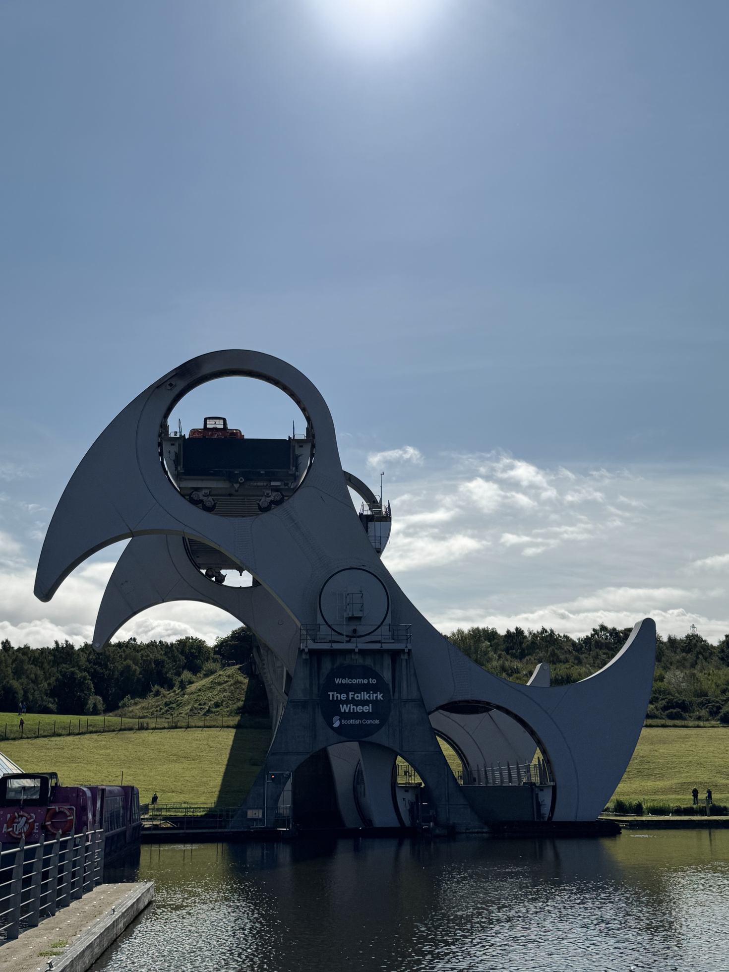 Wir fahren weiter zum Falkirk Wheel einer imposanten Schiffshebeanlage, welche Schiffe über einen Höhenunterschied von 24m mittels zweier Tröge befördert. Da Touristenfahrten angeboten werden, haben wir das Glück nicht lange auf eine Schiffsbeförderung warten zu müssen. Das Schiff fährt unten in den Trog, dieser wird abgedichtet und das Rad dreht sich. Oben angekommen wir der Trog geöffnet und das Schiff fährt raus, die ganze Drehung dauert etwa 4 Minuten und ist unendlich spektakulär. Wir nutzen den Halt, um einen Kafi zu trinken und einen Scone zu teilen.