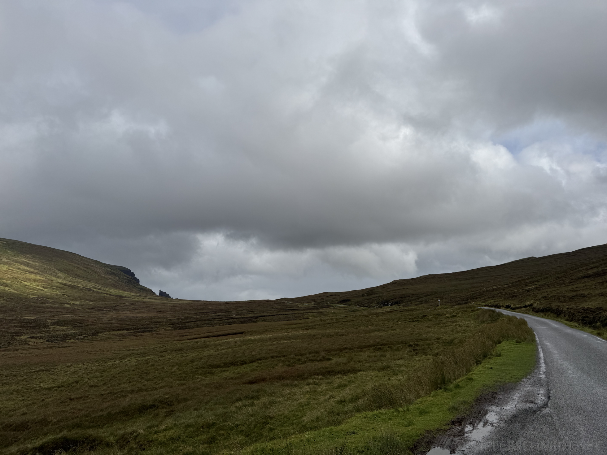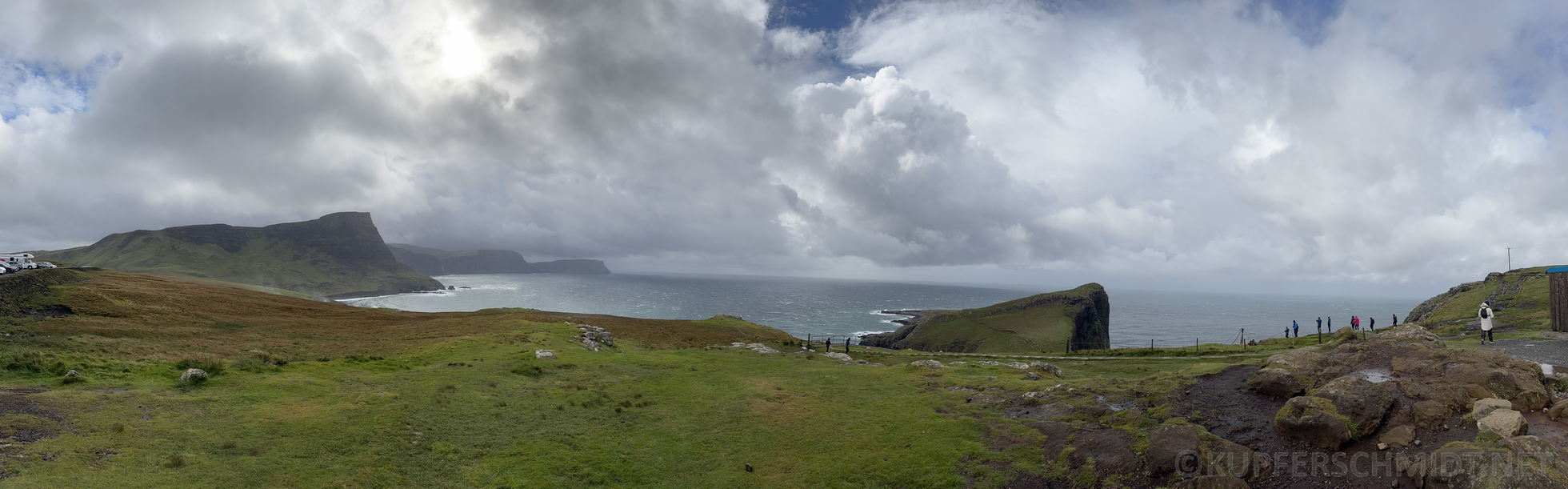 Da wir am Abend wieder in’s gleiche Hotel zurückkehren, ist die Marschbereitschaft schnell erstellt. Da das Hotel an einer Einbahnstrasse liegt, fahren wir abermals über eine abenteuerliche Strasse zur Hauptstrasse und dann über die Skyebridge auf die Insel. Unser erstes Ziel ist zugleich der westlichste Punkt unserer Reise, Neist Point, welche etwa gleich weit westlich liegt, wie die Grenze zwischen Spanien und Portugal. Neist Point ist wahnsinnig eindrücklich. Eine schroffe, harte Landschaft und wenn man sich über den steilen Weg durch den scharfen Wind kämpf, kommt man zu einem Leuchtturm, welcher zum ersten Mal am 1. November 1909 leuchtete und seit 1990 automatisiert seinen Dienst verrichtet. Anschliessend führt uns der Weg weiter über die Insel und wir werden so richtig durchgespült. Mit vielen uuuh’s und oooh’s führt uns die Quiraing Road über den gleichnamigen Pass auf die Ostseite der Insel und dort über das malerische Portree mit seiner farbigen Häuserzeile am Hafen weiter und über die Skyebridge zurück nach Kyle. Auf dem Weg zurück bemerken wir immer wieder, dass vieles der eindrücklichen Landschaft leider hinter Wolken verborgen liegt. Auf Skye gäbe es noch vieles zu entdecken. So gibt es einige Whiskydestillerien. Die vermutlich bekannteste ist die Talisker Brennerei. Ausserdem könnte man noch zum Old Man of Storr wandern, da wir aber Biker sind, fällt das flach. Zurück im Hotel warten wir bei einem Skyebier darauf, dass unserer Klamotten wieder trocknen.